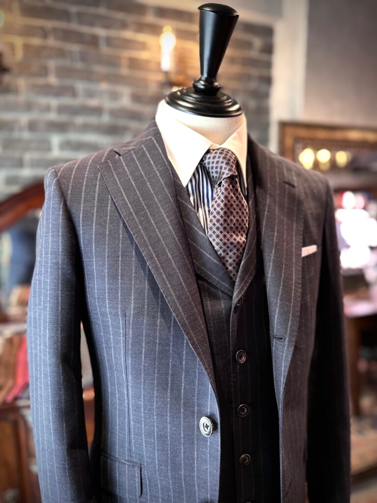英国ラッシャーミルズの濃紺ストライプでスリーピースをお世話になりました