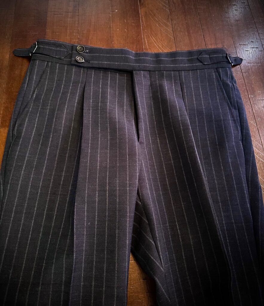 襟ののぼりや立体的なロール感、パンツのライン全てが美しく出るフレスコ生地は仕立て映えしますし、シワの回復力にも優れており頼りがいのある1着です。