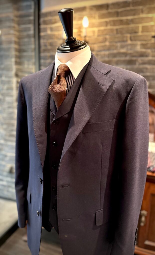 英国ラッシャーミルズの濃紺無地でスリーピースをお世話になりました