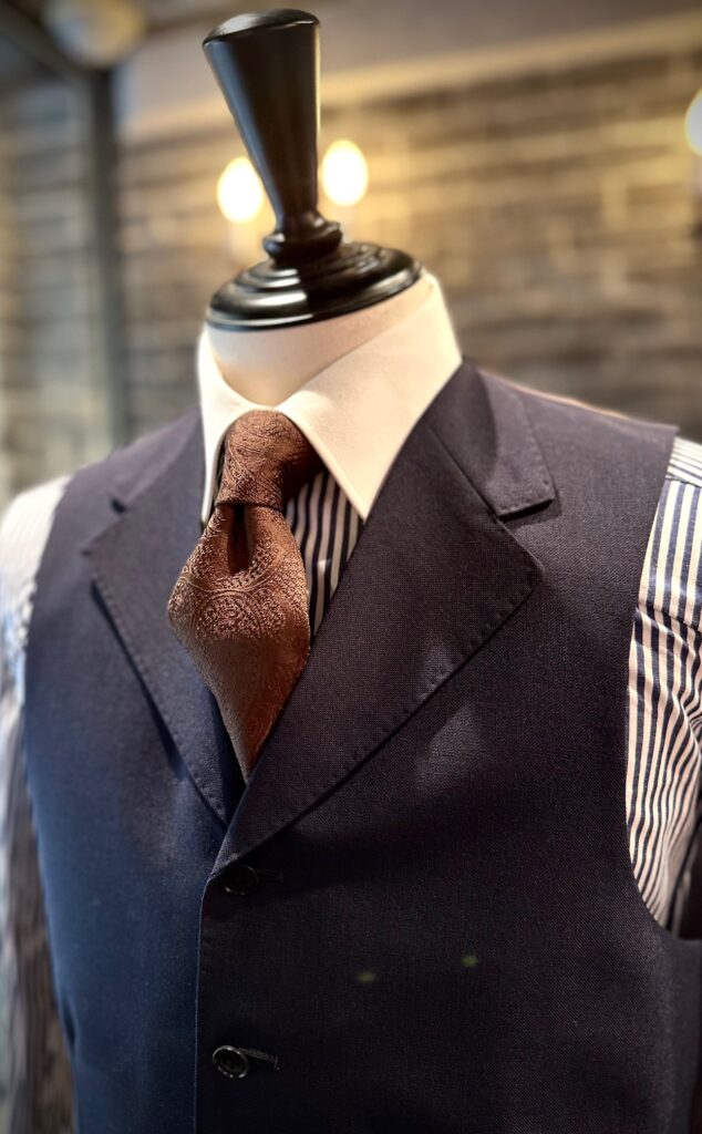 ベストは太めの襟付きにされよりクラシックに。
