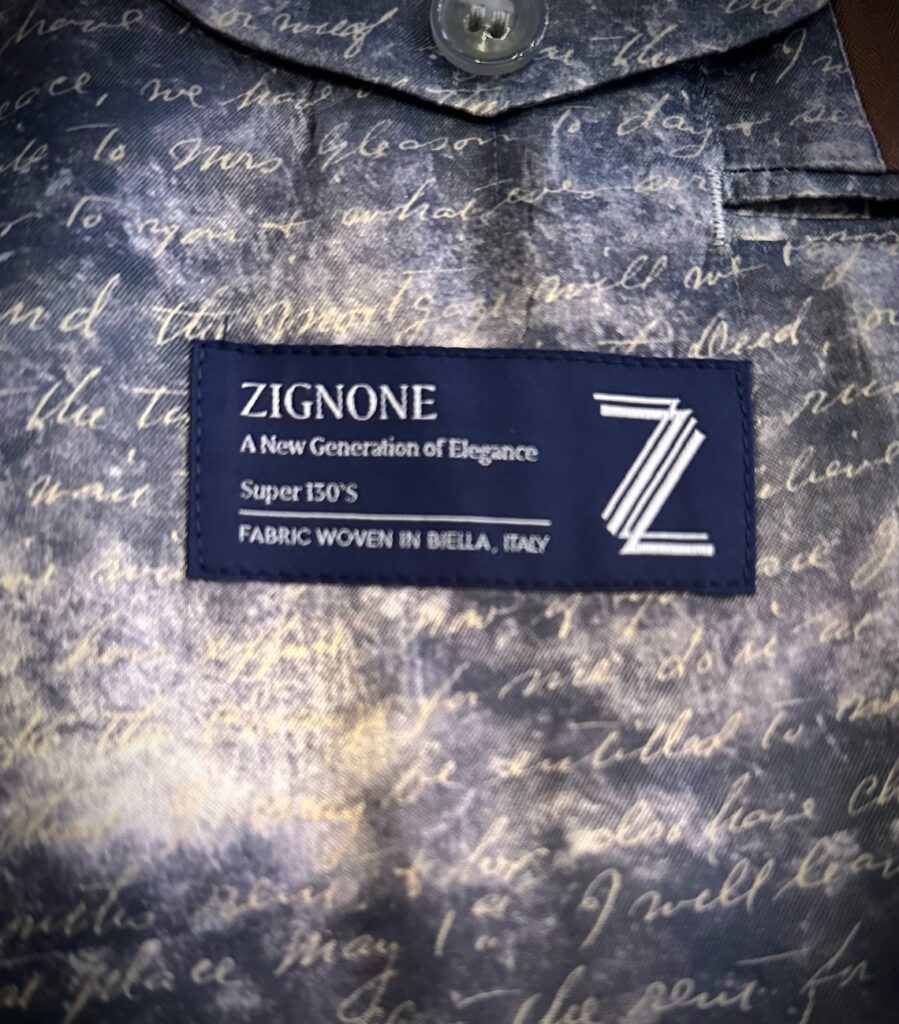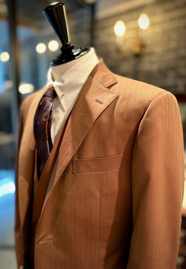 ブラウンベースに赤糸を織り交ぜており、光のあたり方で様々な表情を見せてくれるこちらのスーツはただただオシャレです。