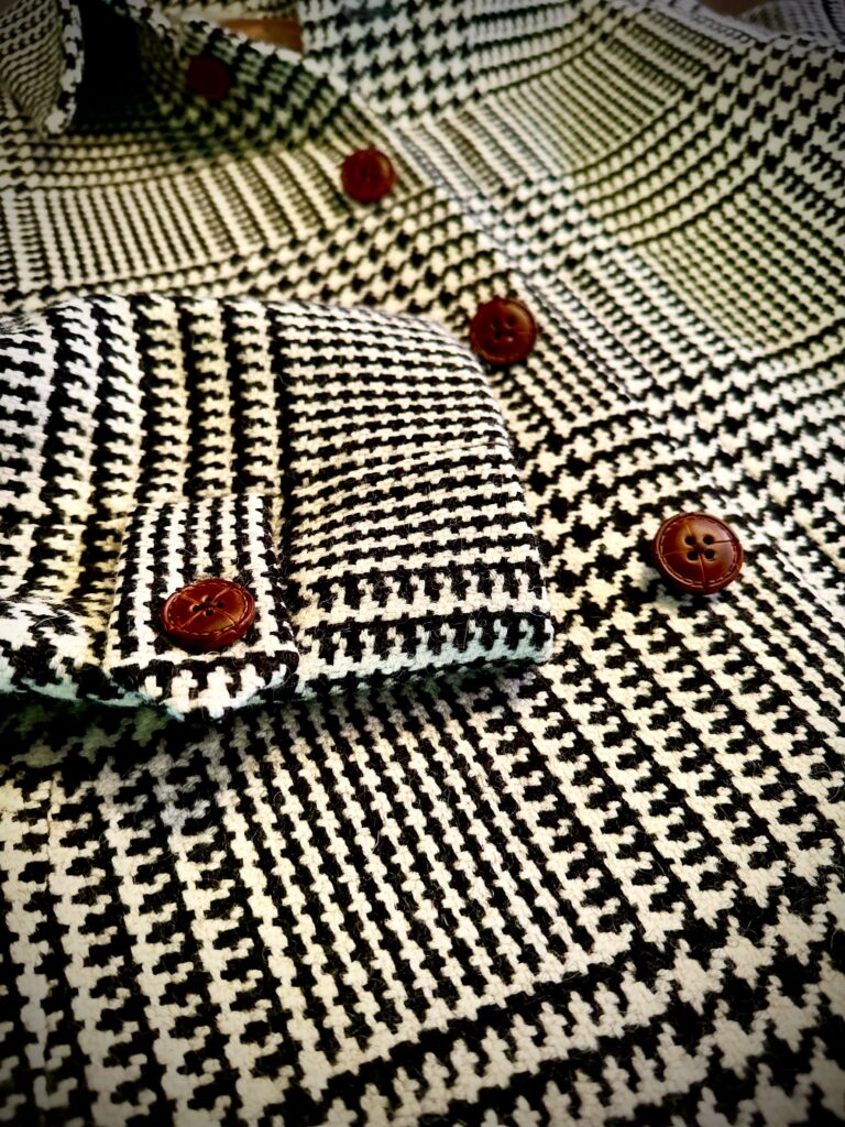 この柄は肩先をセットインで仕立てるよりラグランにすることによってイケイケ感が出ずただただオシャレです。