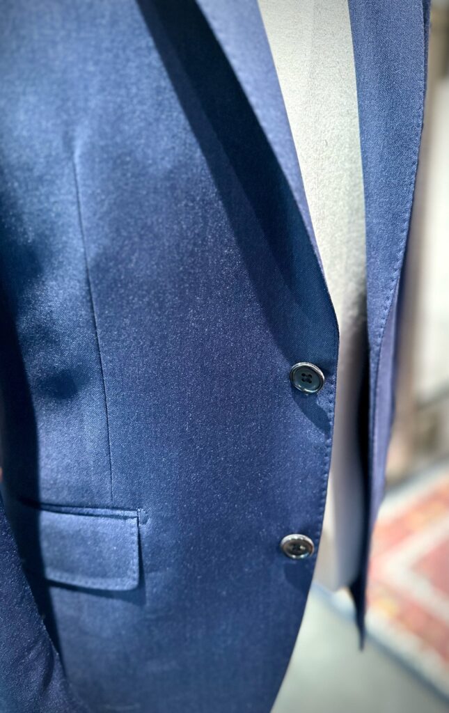 一見鮮やかなブルーですが、生で見ると少しくすんだブルーでイタリアらしい上品さを兼ね備えたスーツに仕上がっております。