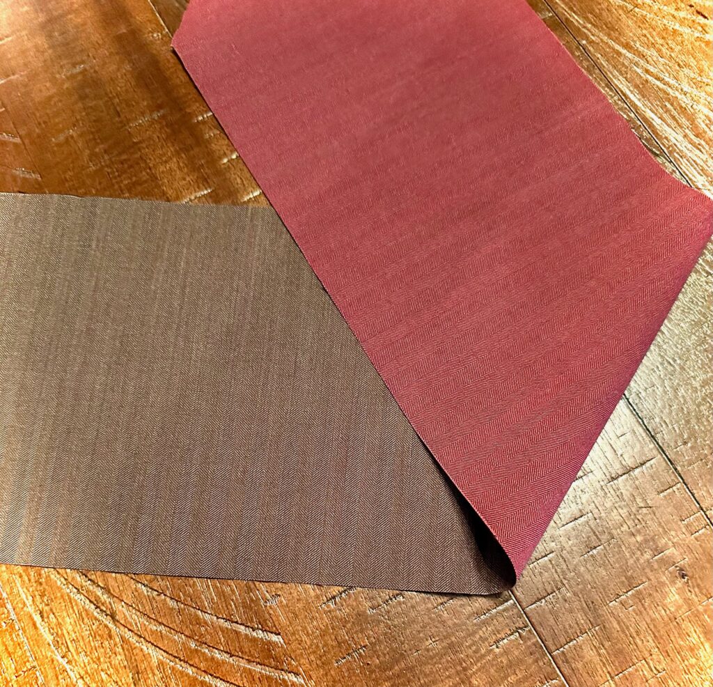 一見、ブラウンのスリーピースですが実はこちらの生地、経糸は赤糸で織り上げており、綾織りなので裏はお写真の通り真っ赤です!