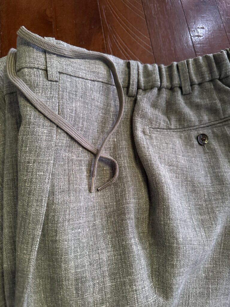 リネン素材の生地でドローコードパンツをお世話になりました。