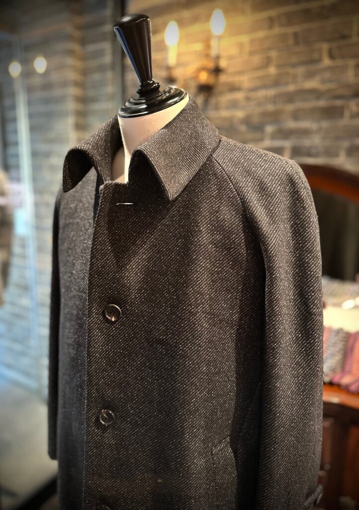 エンメテックスのチャコールグレーでラグランコートをオーダーいただきました。