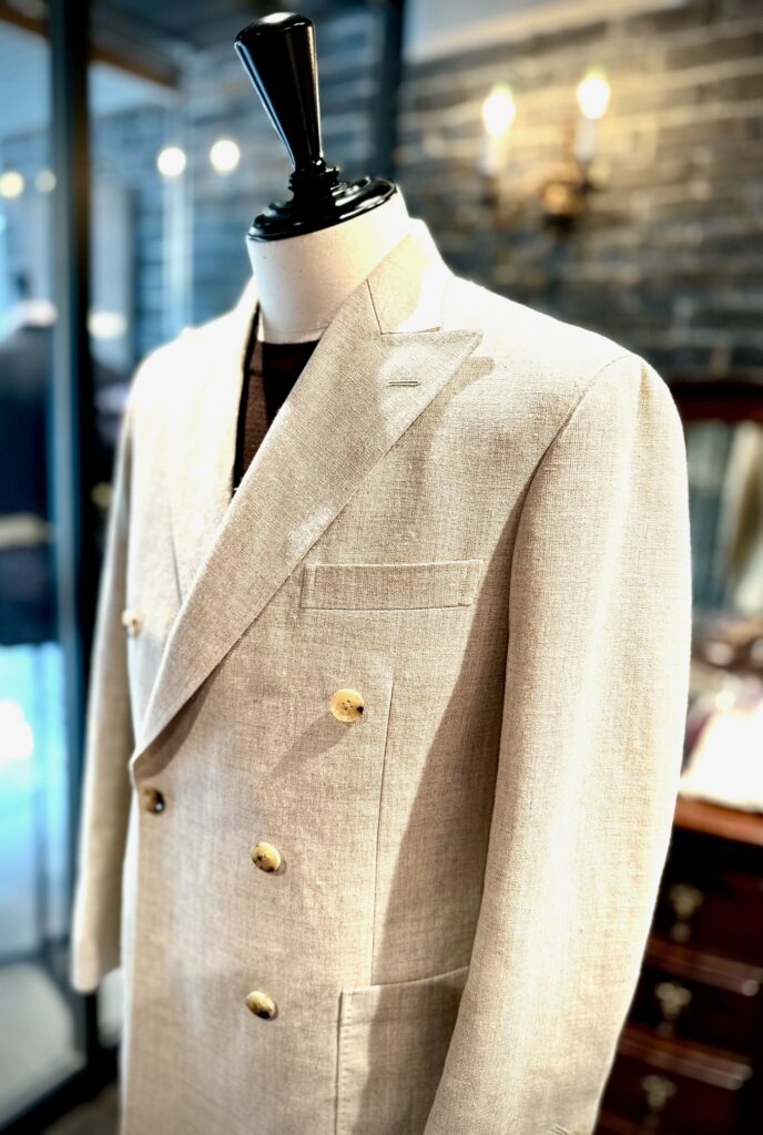 こちらは東南アジア等への出張や、ゴルフの行き帰りに涼しく着られるジャケットをということで英国ハリソンズのリネン素材でお世話になりました。