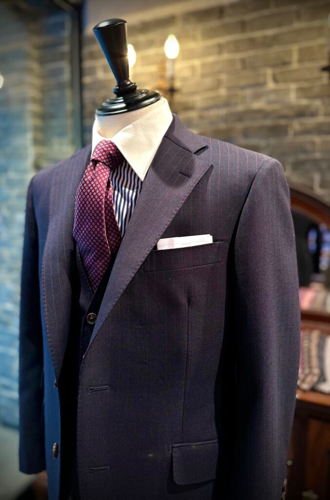 濃紺に赤のストライプの入った生地でスリーピースをオーダーいただきました。