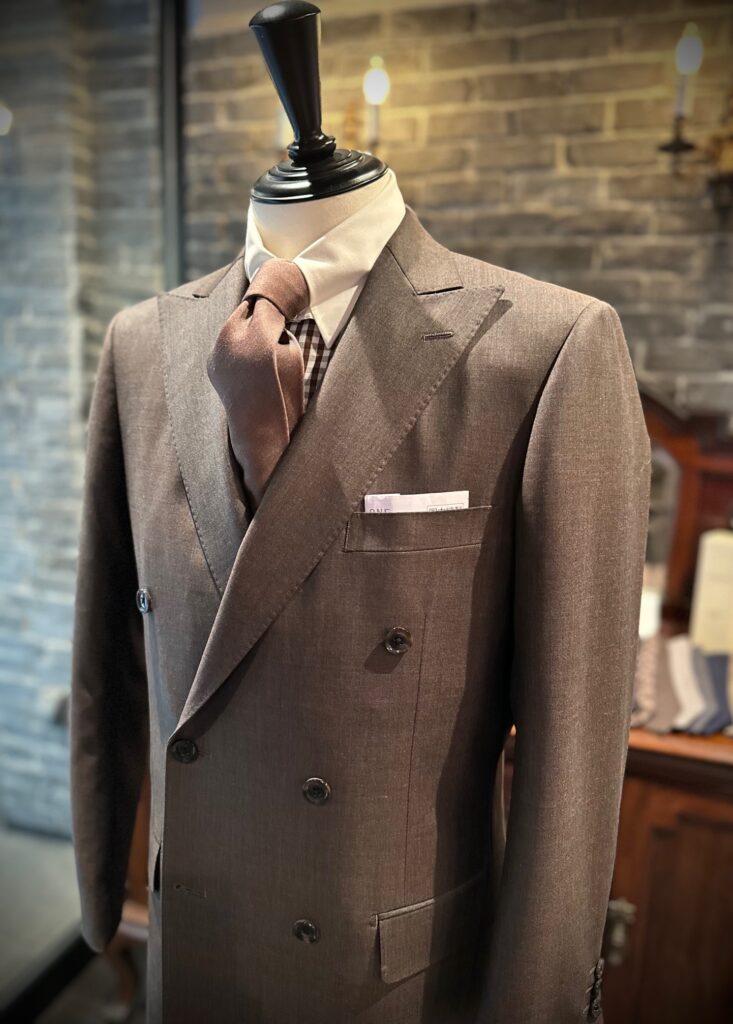 御幸毛織のFANCY TEXのブラウンでダブルのスーツをオーダーいただきました。