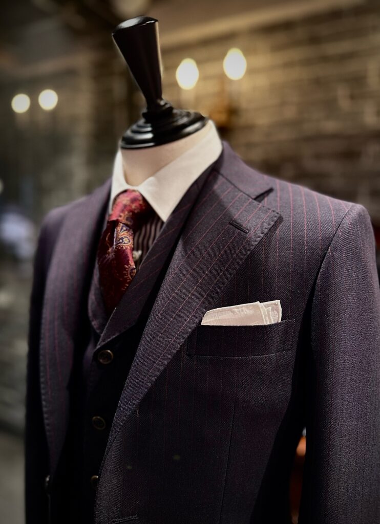 生地の色味が濃く、そこに赤のストライプが入ると主張しすぎず馴染むので威圧感のない渋い1着に仕上がりました。
