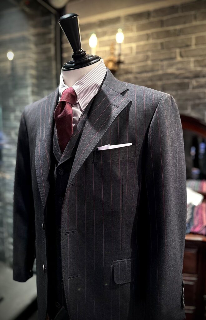 英国クリソルドのチャコールグレーに赤ストライプの生地でスリーピースをオーダーいただきました。