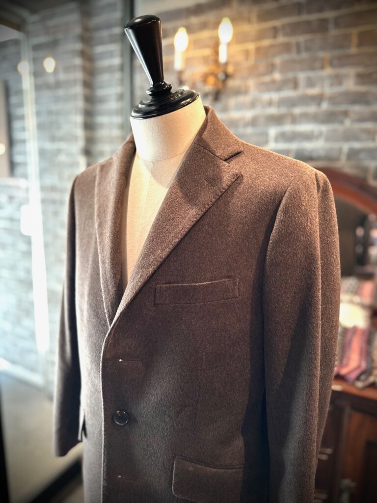 コロンボのブラウンのカシミアでチェスターコートをオーダーいただきました。