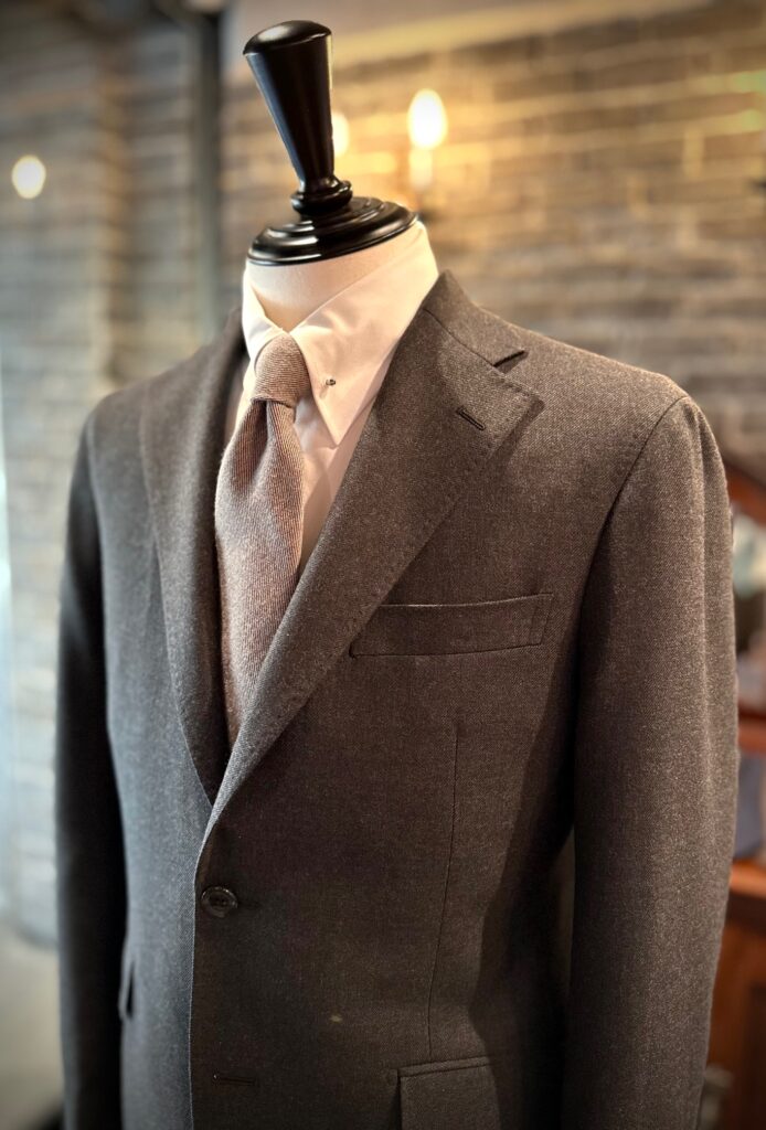チャコールグレーでもカチッとしすぎず、柔らかく優しい印象に仕上がるのはこの生地感からくるもので本当に上品な仕上がりです。
