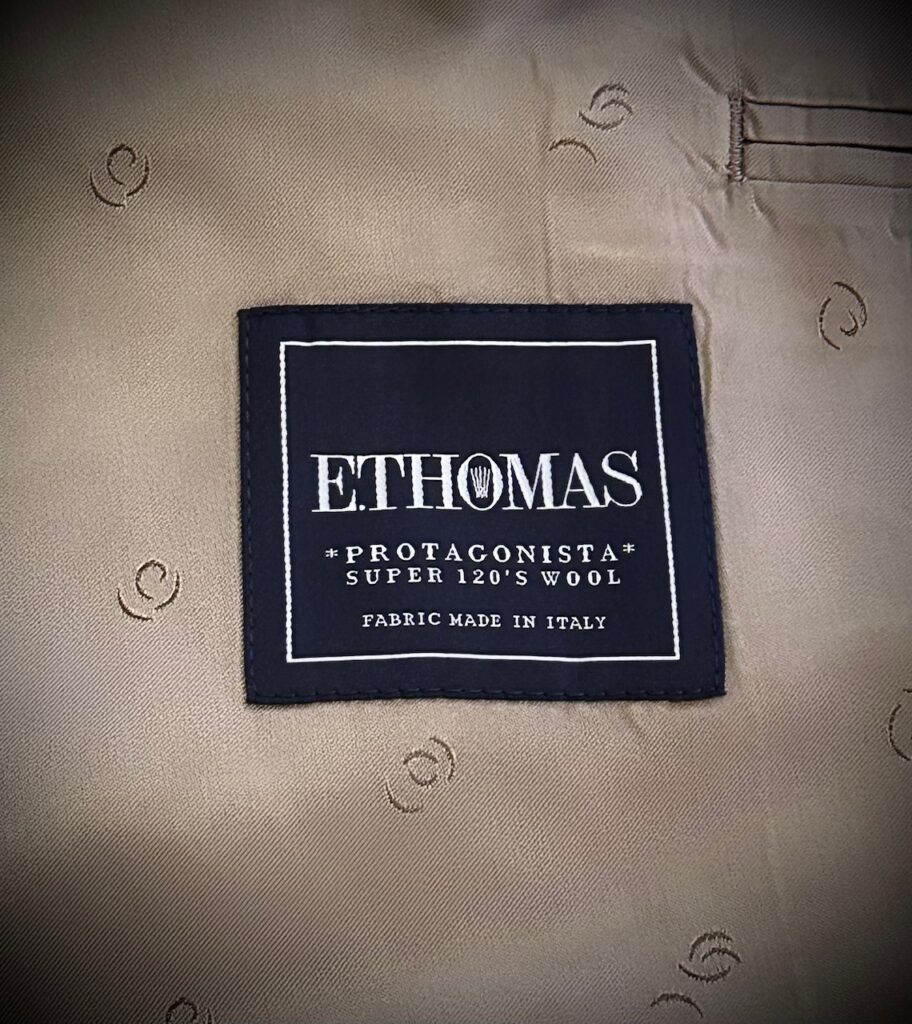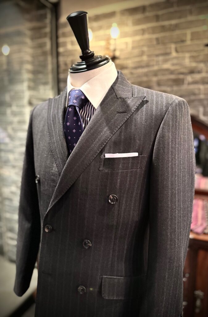 イートーマスのネイビーストライプのフランネルでダブルのスーツをオーダーいただきました。