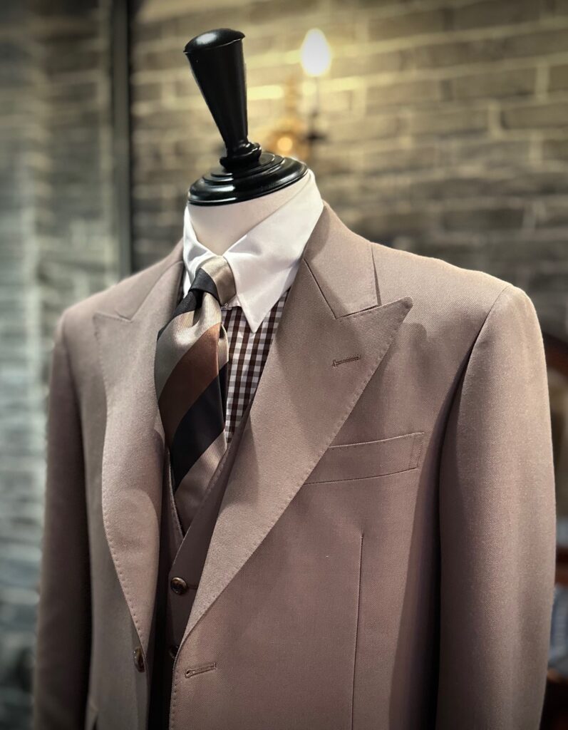 ビジネスというよりはオシャレ着として使われたいというご要望でしたので、ゴージライン(襟の高さ)は少し低めにお仕立てさせていただきました。