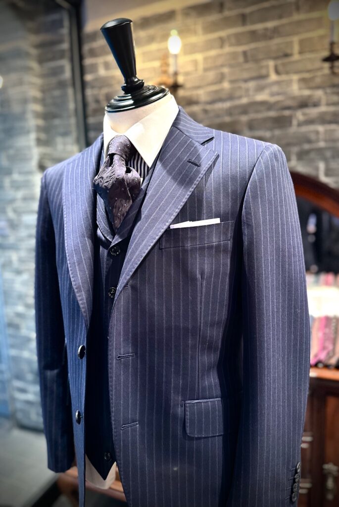 フィンテックス・オブ・ロンドンのネイビーストライプでスリーピースをオーダーいただきました。