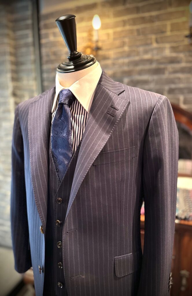 フィンテックス・オブ・ロンドンのネイビーストライプでスリーピースをお世話になりました。