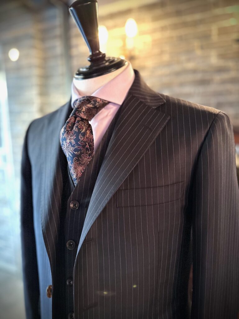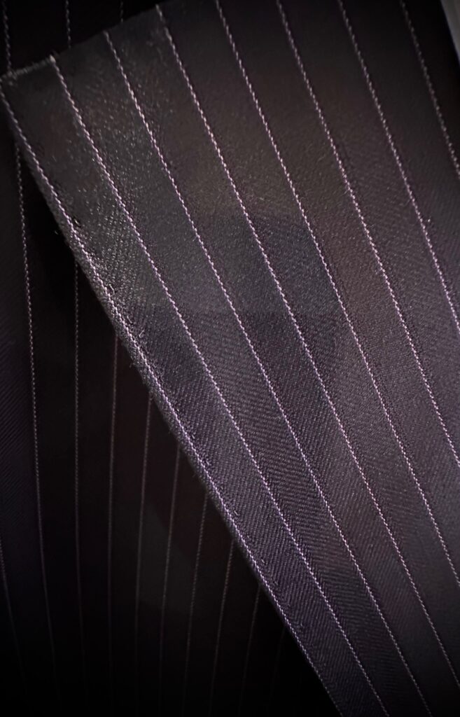 ストライプも遠目に見るとわかりにくいのですが、実はパープルストライプというところが悪目立ちせず、生地の色に馴染むので紳士的で品のあるストライプスーツに仕上がります。