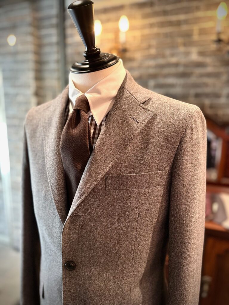 色味もベースはライトグレーではありますが、杢糸で織られているので黒や白の部分が全体に出て雰囲気のある1着に仕上がりました。