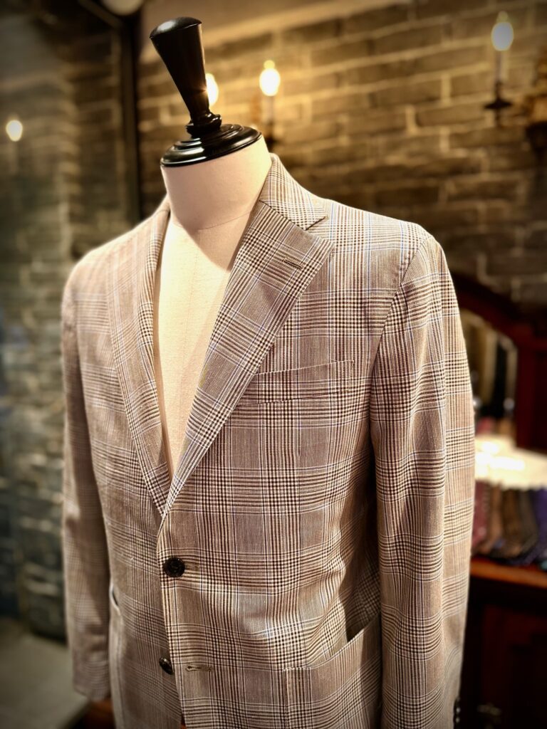 ウール・シルク・リネンの三者混で織り上げられており、ウールのしなやかさとコシをベースに、シルクの上品な光沢、リネンの清涼感ある風合いが加わることで、見た目にも着心地にも季節感のある一着に仕上がりました。