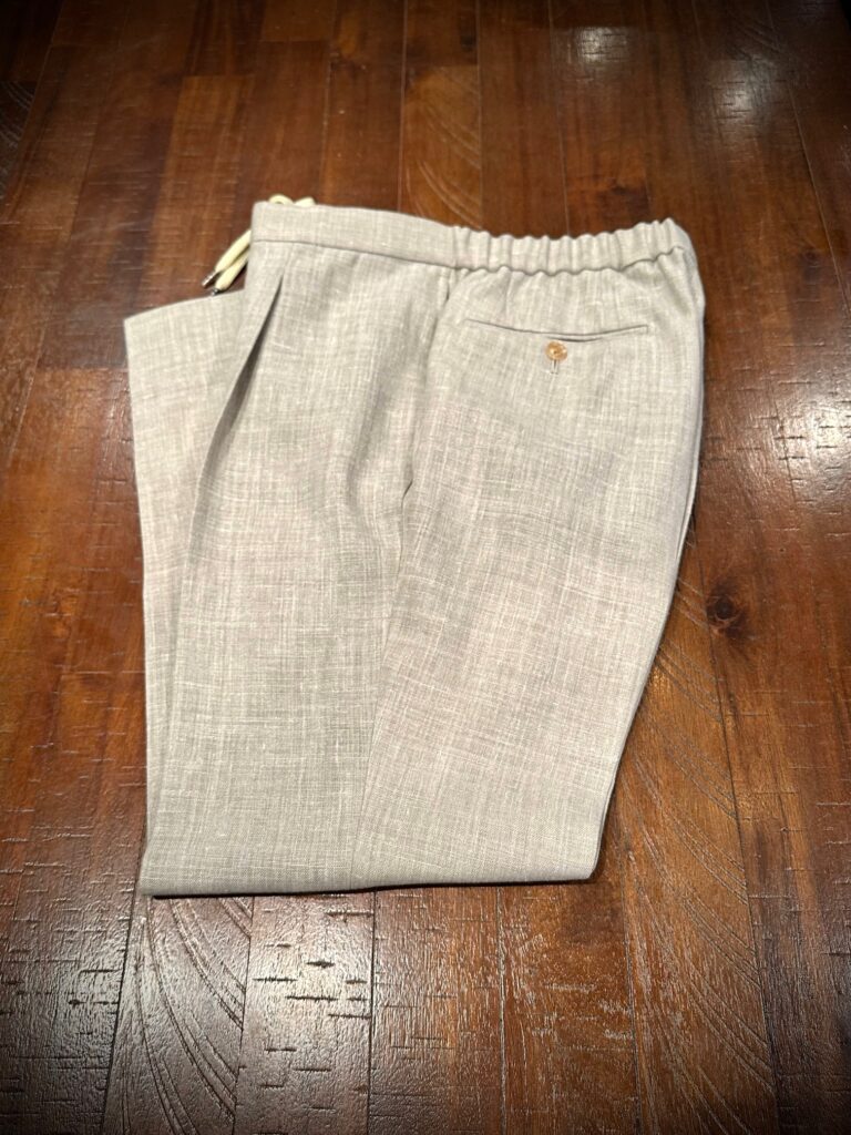 パンツはドローコードでウエストはゴム仕様、お客様のご要望で紐は内側に付け、普段は見えない仕立てにさせていただいております。