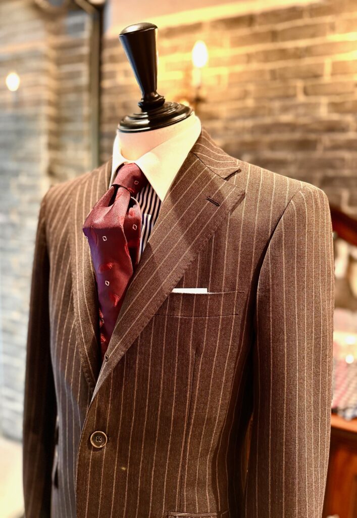 黒糸を織り込んだダークブラウンを基調とし、トーン違いのブラウンのストライプの入ったこちらの生地。