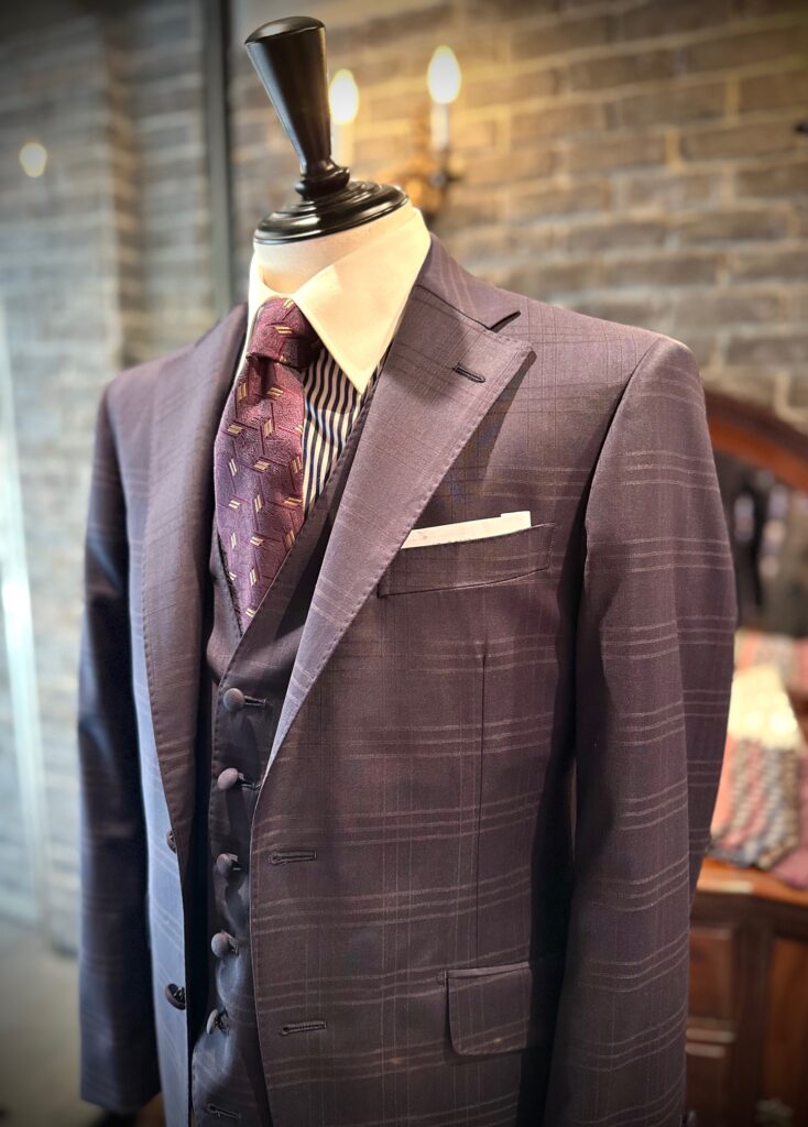 オーダーいただきましたお客様は、生地の光沢と、濃紺にほんのりと映えるパープルチェックに見た瞬間から心を惹かれておられました。