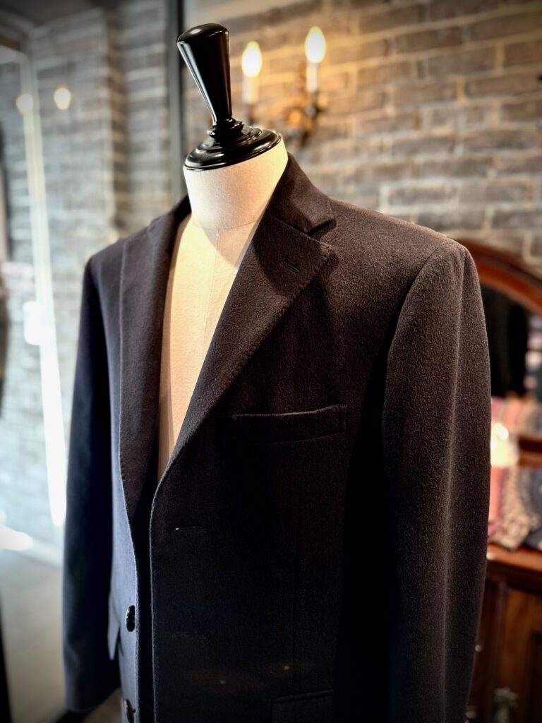 混紡生地になりますので、カシミアの滑らかで柔らかいタッチ、光沢感はそのままに、メインはウールですのでカシミア100%ほど気を遣わずご着用いただけるのもこの生地の魅力の一つです。