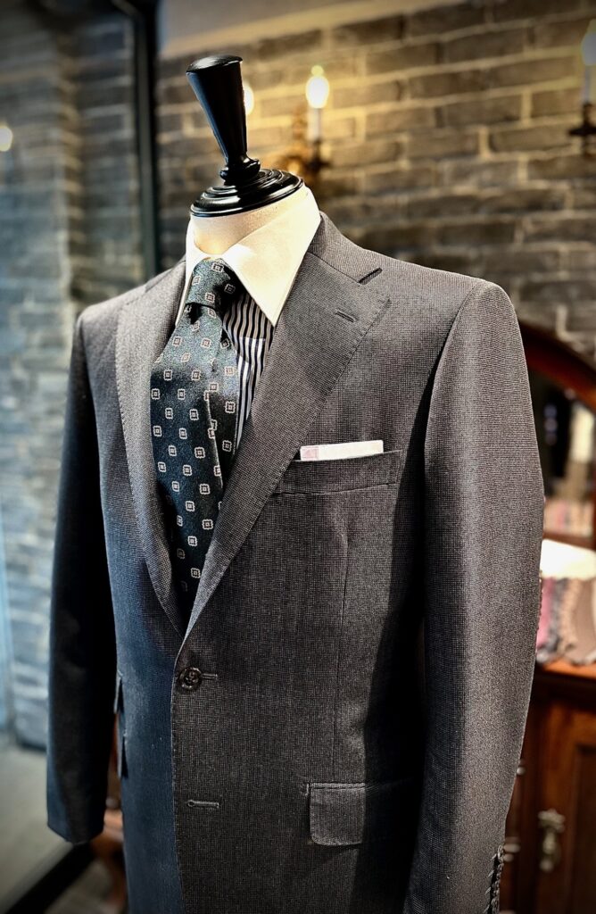 プリント柄にはない立体感と品の良さがあり、無地スーツの延長線で使える織り柄として、長く愛されてきました。