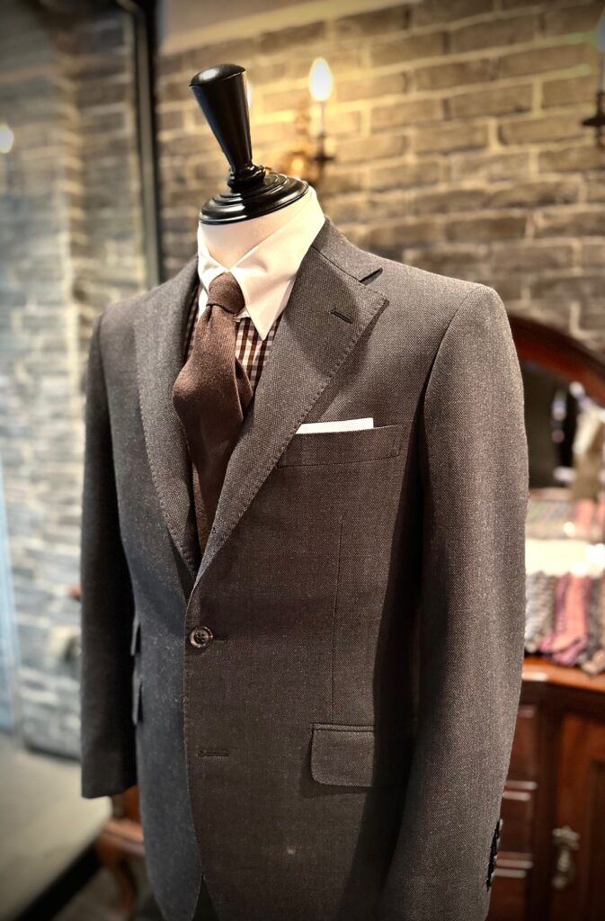 鳥の目のように小さな斑点模様が並ぶバーズアイは、遠目には無地に見えつつ近くで見ると表情がある柄で英国スーツらしい落ち着きと奥行きを演出してくれます。