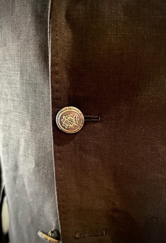 ブラックのリネンにメタル釦がカッコよすぎて仕上がり品に見とれてしまいました。ニヤニヤと。