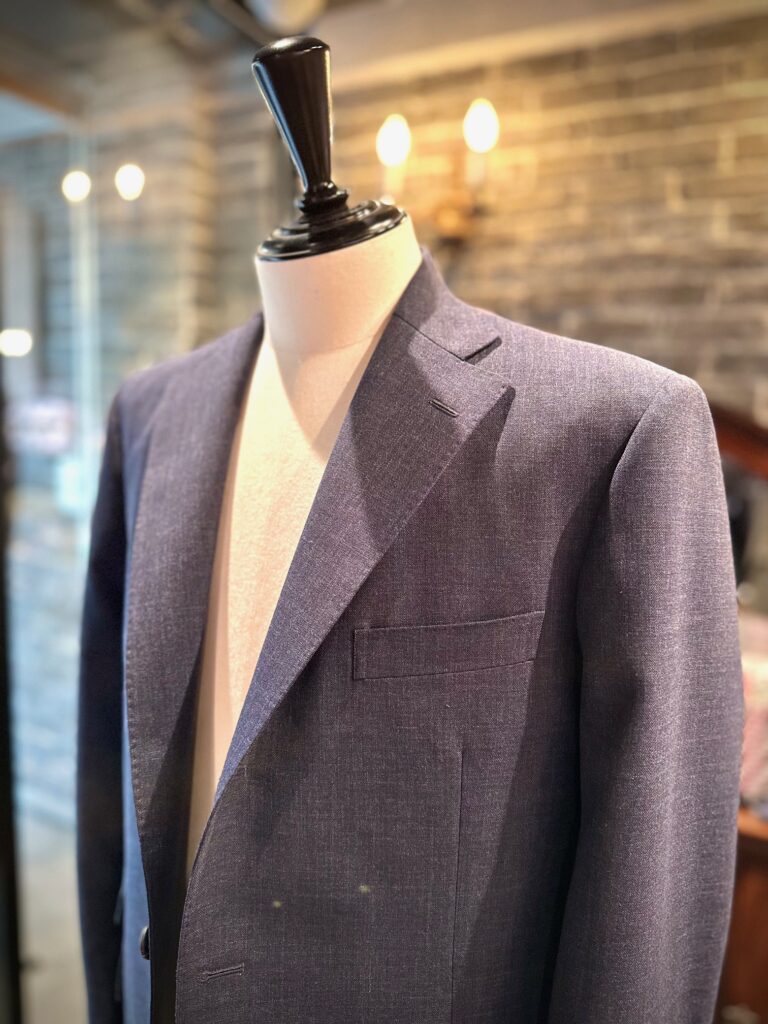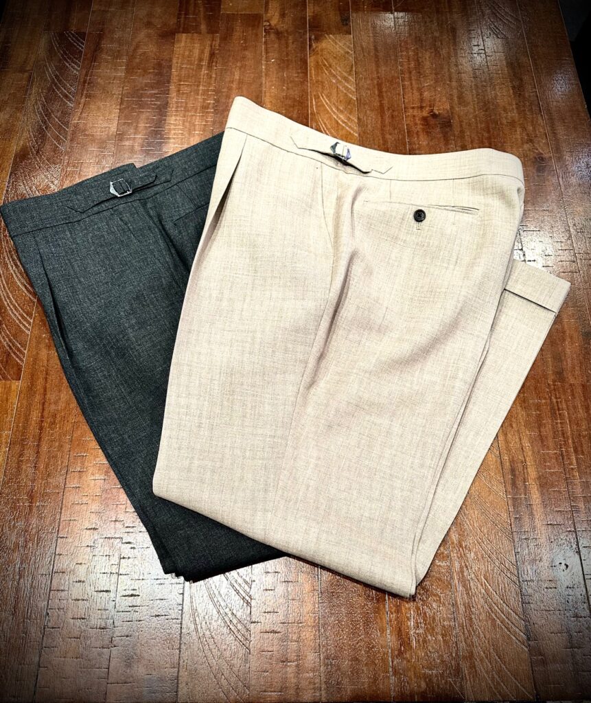 今回ジャケットでお選びいただいた色味は淡いネイビー、そしてパンツは用途に合わせて着分けられるようグレーとベージュのジャケット同様フレスコ生地でお世話になりました。
