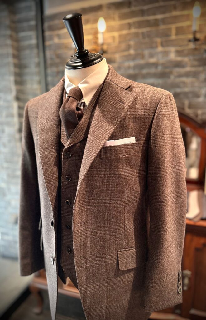 その中からブラウンのグレンチェックでスリーピースをオーダーいただきました。