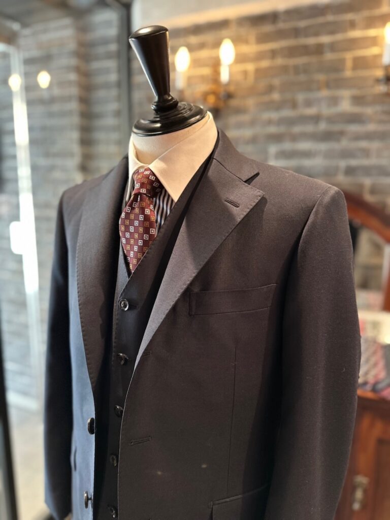 英国アルフレッドブラウン社のウッドヘッドで濃紺無地をスリーピースでお世話になりました。