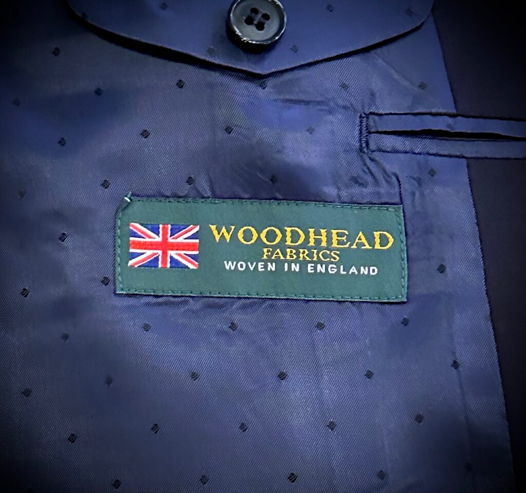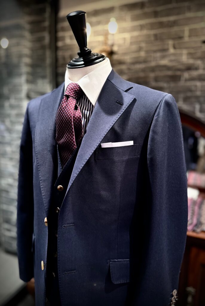英国アルフレッドブラウン社のウッドヘッドで濃紺無地をスリーピースでお世話になりました。