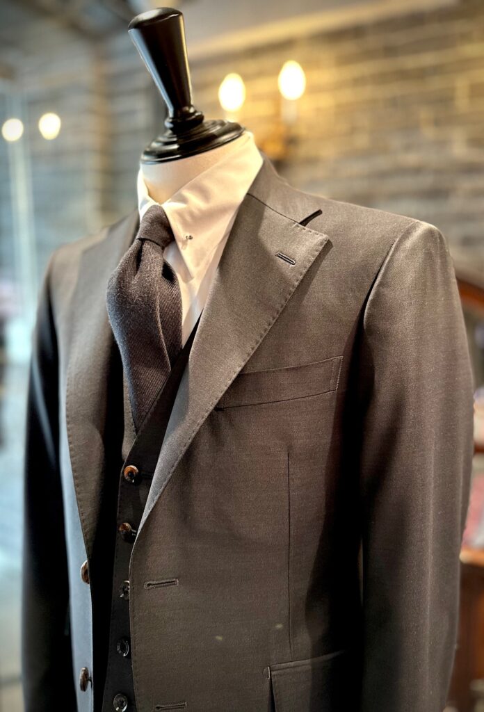 非常に滑らかなタッチと光沢感が特徴的で、ビジネスユースというよりは、ここぞという場面で活躍してくれる1着になります。
