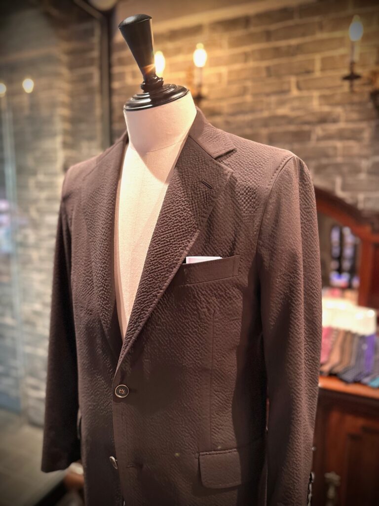 一般的にシアサッカーといえばコットン素材のものが多いですが、こちらはウールで織り上げられたシアサッカー生地です。