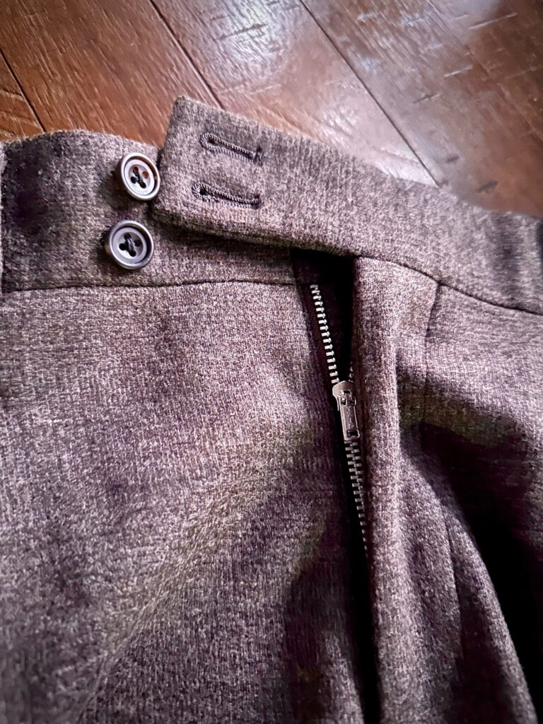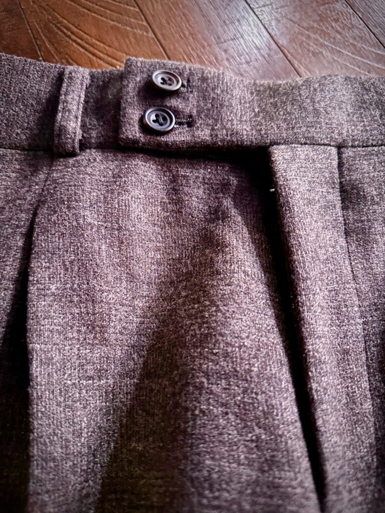 ベルトの帯巾を通常より太くし、持出し部分の釦も2個に。タック入りのパンツとの相性がいいですね♪